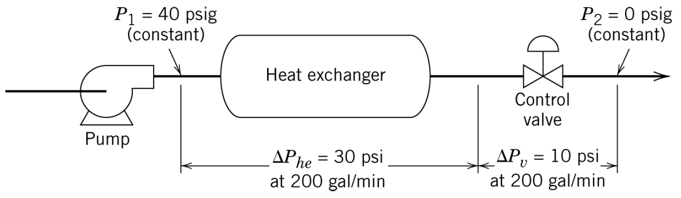 The process fluid has a density of \(\rho=\SI{9}{lb_{m}/gal}\). Assume that the pressure drop across the heat exchanger \(\Delta P_{he}\) is proportional to the volume flow rate squared, \(\dot{V}^{2}\), with \(\Delta P_{he} = 0\) at \(\dot{V} = 0\) and with \(\Delta P_{he} = \SI{30}{psi}\) at \(\dot{V} = \SI{200}{gal/min}\). The total difference in pressure between \(P_{1}\) and \(P_{2}\) is \(\SI{40}{psig}\), regardless of the flow rate.