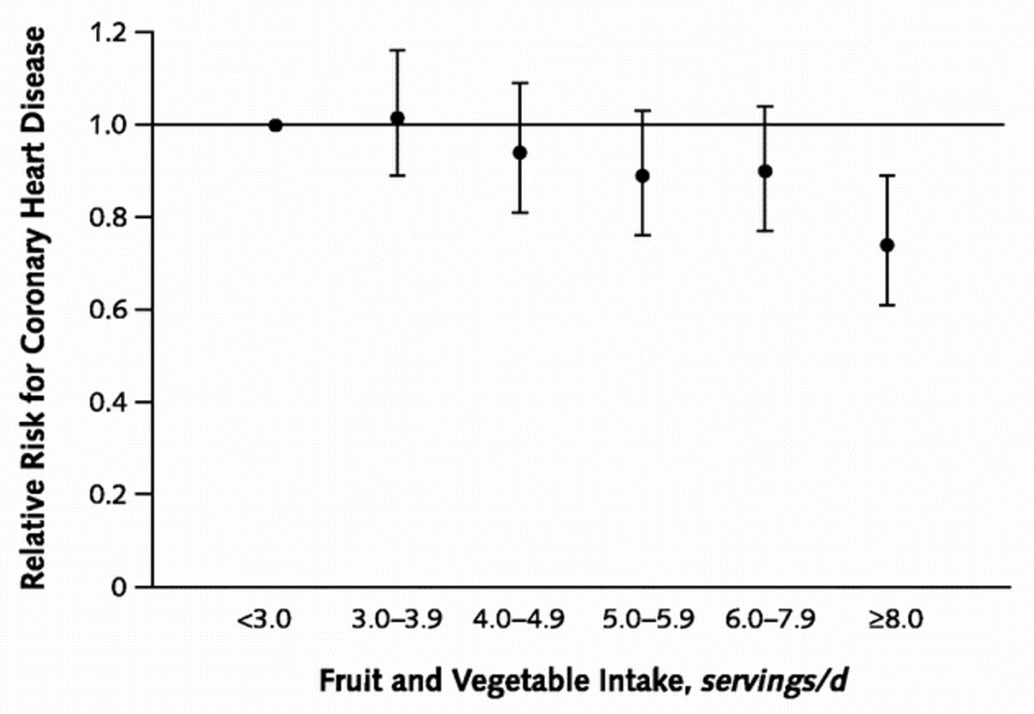 Your physician recommends increasing your intake of fruits and vegetables from two servings a day to six to reduce your risk of coronary heart disease and hands you a glossy pamphlet containing the following plot.