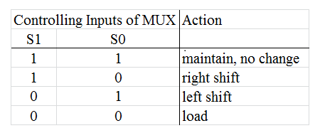 In the design, switching among different operations can be done by using a multiplexer. One operation at a time will be selected by entering corresponding control bits to the MUXas summarized in Table 1.: