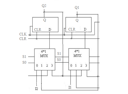 A 2-bit slice of the 8-bit PIPO shift register may be implemented as shown in Figure 2. When S1S0 = 11, output Q of D Flip-Flop is selected as input of D Flip-Flop by MUX so output data will remain the same. When S1S2 = 00, input bit I is selected by MUX to be loaded to D Flip-Flop. When S1S2 = 10, output Q from left side D Flip-Flop is selected as the input for current D flop-flip so that data bit is shifted in right direction. When S1S2 = 01, data bit is shifted in left direction.
