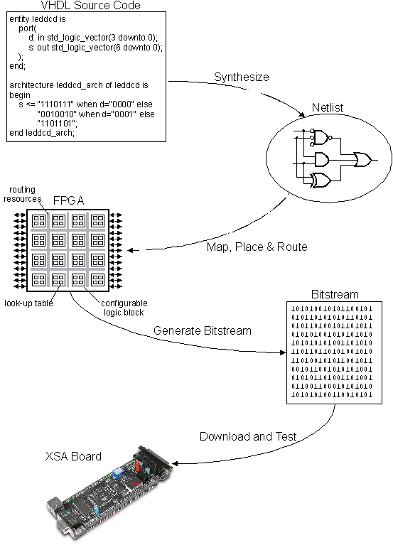 The illustration on this webpage provides the methodology that one will follow to use Verilog or Very high speed integrated circuit Hardware Description Language (VHDL) to implement a design onto the XESS protoboard hardware. The first step shows the VHDL code. Before a netlist is developed, the (Verilog or) VHDL is simulated using Mentor Graphics ModelSim for logic and timing verification of the design. This step is not shown in the diagram below. Once the design simulates as intended, then the (Verilog or) VHDL design is transformed/synthesized into a netlist by the Xilinx Project Navigator or Mentor Graphics LeonardoSpectrum Electronic Design Automation (EDA) tools. A netlist is a circuit representation of the Verilog or the VHDL source code. The netlist is then placed, mapped and routed onto a desired FPGA device. The placement, mapping and routing is unique for each type of FPGA and it depends on the internal configuration of the FPGA device. Specifically, the device being used is the Xilinx Spartan II FPGA on the XESS protoboard. Once the design is placed, mapped and routed onto the FPGA, a binary file (bit file) representation is generated for the Spartan II FPGA that can then be downloaded ("burned") into the FPGA to implement the logic. The XESS GSXload utility is used to physically download the bit file into the FPGA. Once the bit file is downloaded, the protoboard is ready to verify the design in hardware.