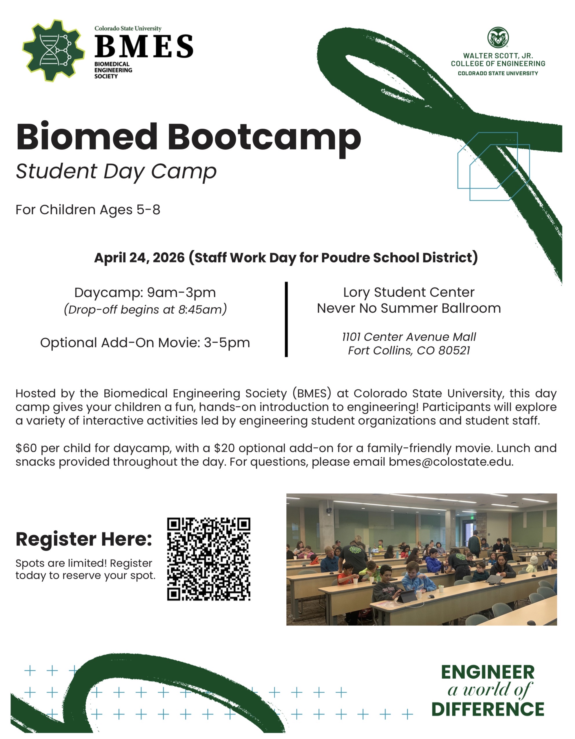 Hey parents! Looking for a fun, educational event for your child on the upcoming Staff Work Day on April 24th? Biomed Bootcamp at Colorado State University hosted by the Biomedical Engineering Society is a perfect option! Designed for children ages 5–8, this full-day camp introduces kids to the exciting world of engineering through hands-on, interactive activities led by trained engineering students and campus organizations.