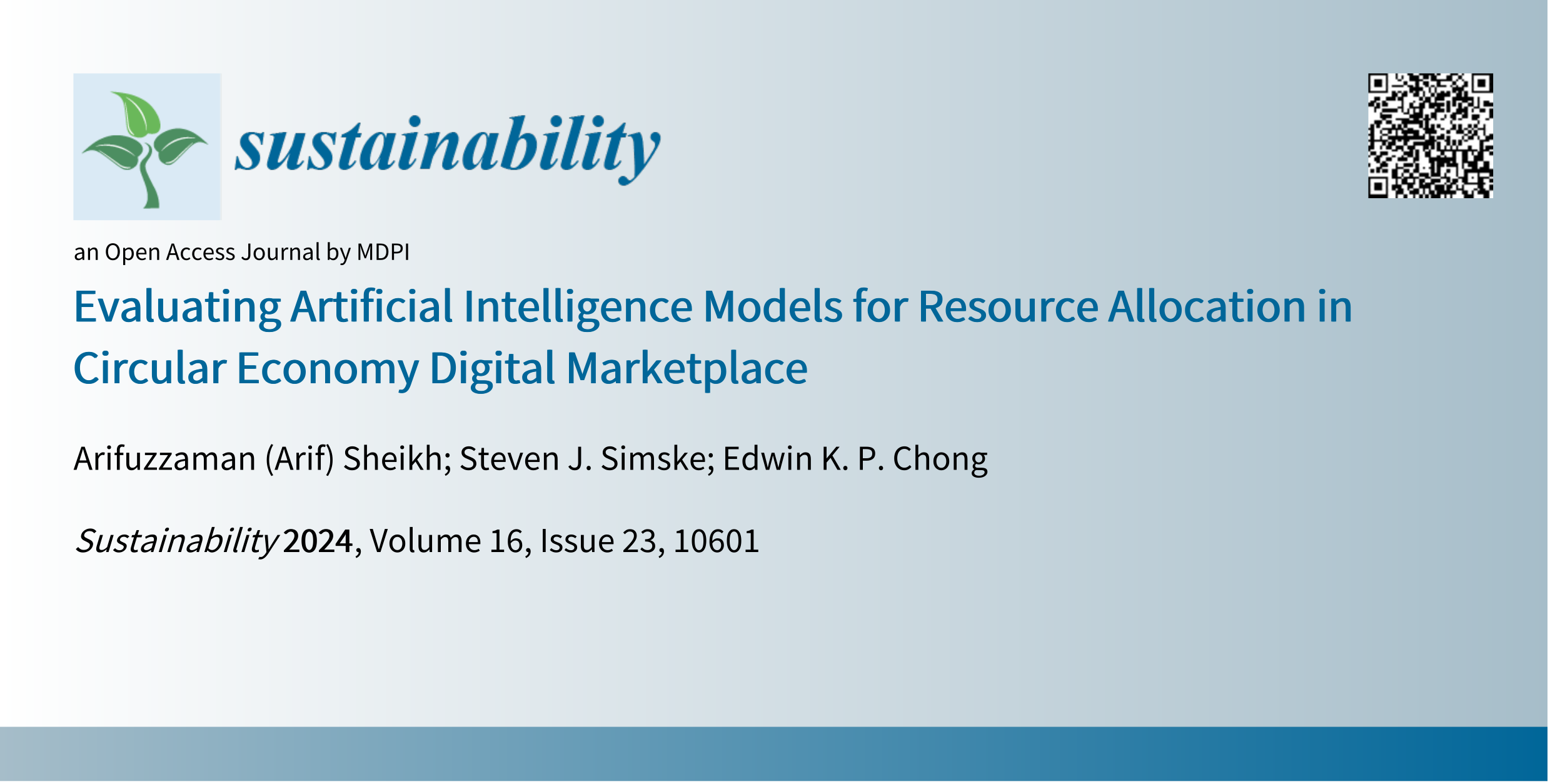 A. Sheikh, S. J. Simske, and E. K. P. Chong, "Evaluating Artificial Intelligence Models for Resource Allocation in Circular Economy Digital Marketplace," Sustainability, vol. 16, no. 23, paper 10601, December 2024. DOI: 10.3390/su162310601