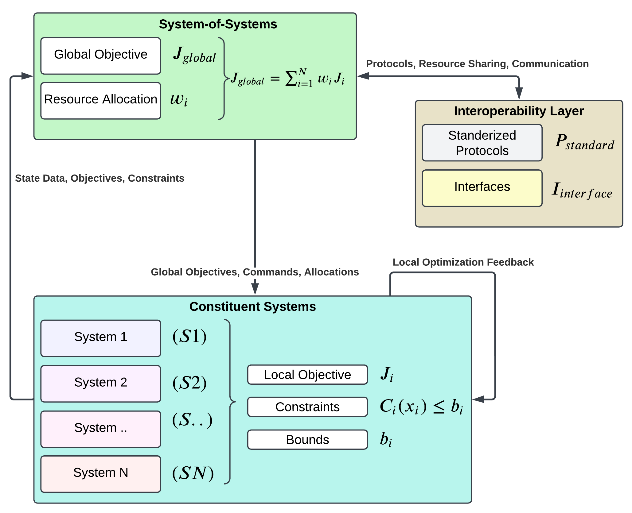 The integration of SoS can be modeled as an optimization problem where the global objective \( J_{\text{global}} \) is maximized while satisfying constraints for individual systems: