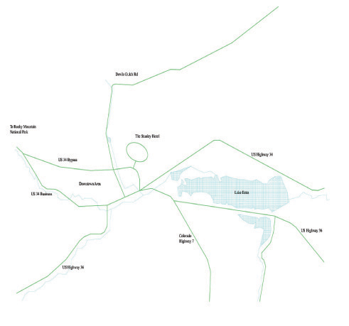 Turn Right on US-34 and the Stanley Hotel is .8 km (1/2 mile) on the right