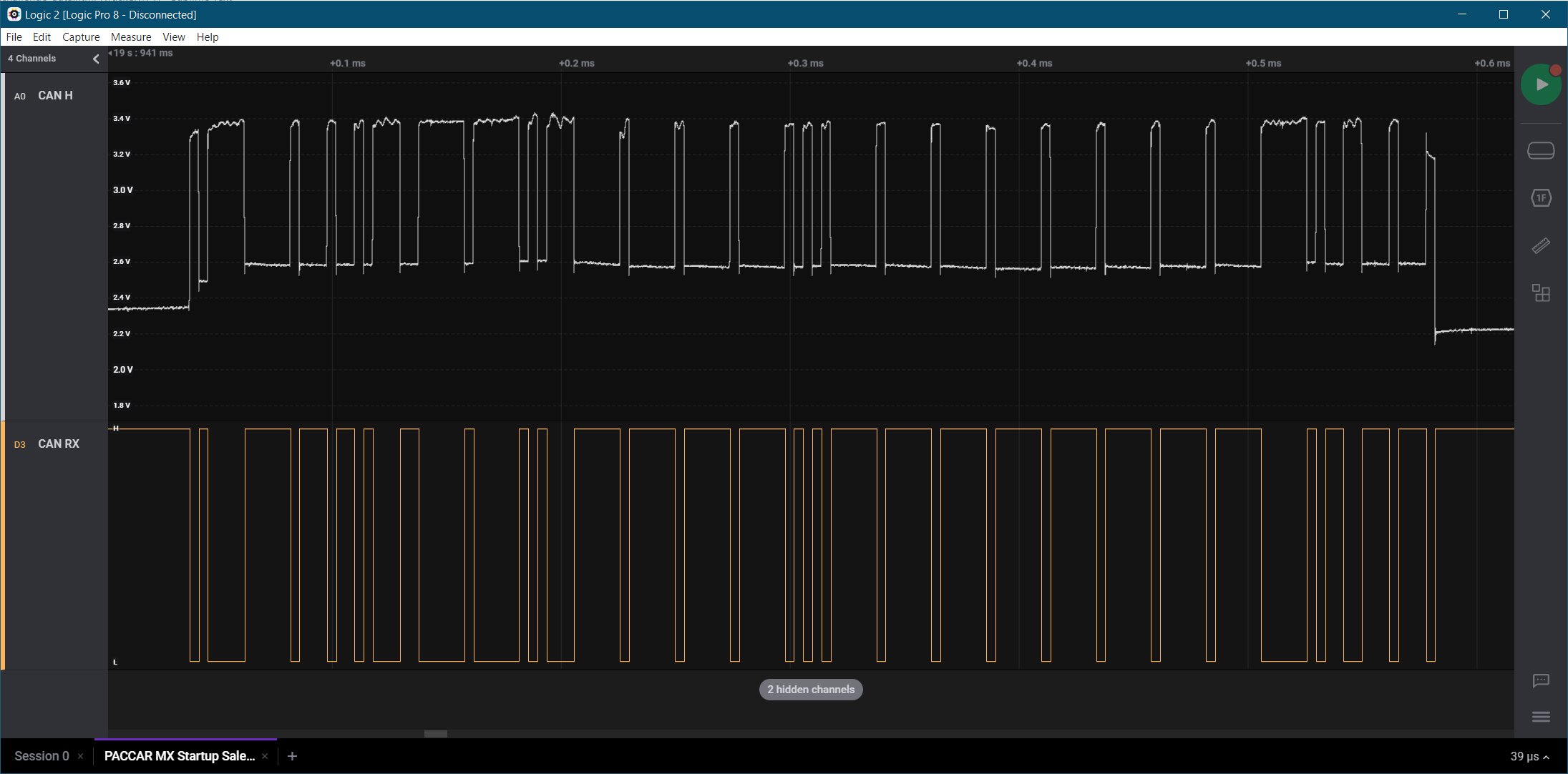 A CAN stream was captured from a PACCAR MX engine communicating at 250,000 bits/second on a J1939 network. Two signals were captured: 1) the analog voltage for the CANH signal line (pin C of the 9-pin diagnostic connector) and 2) the digital signal from the CAN RX pin of the CAN transceiver. Each file is available as a comma separated value (CSV) file: