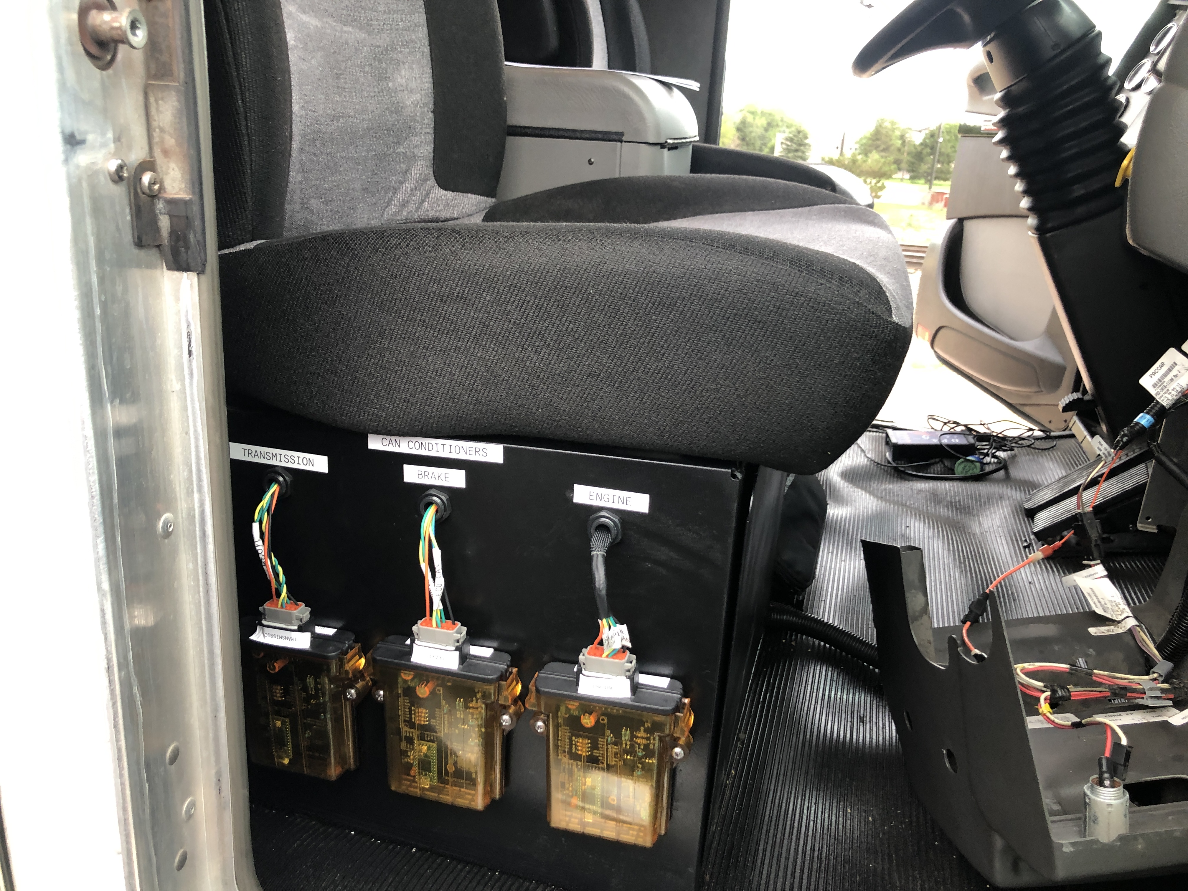 The connection from the engine compartment runs through the firewall and into the cab. It is terminated below the passenger seat, facing the door for easier access. These connections are in place for the brakes, transmission, and engine. At the end of this connection is a middleperson device that can read and write to each side of the J1939 network. This unique feature gives researchers the ability to affect the network traffic inside the vehicle while it is running.