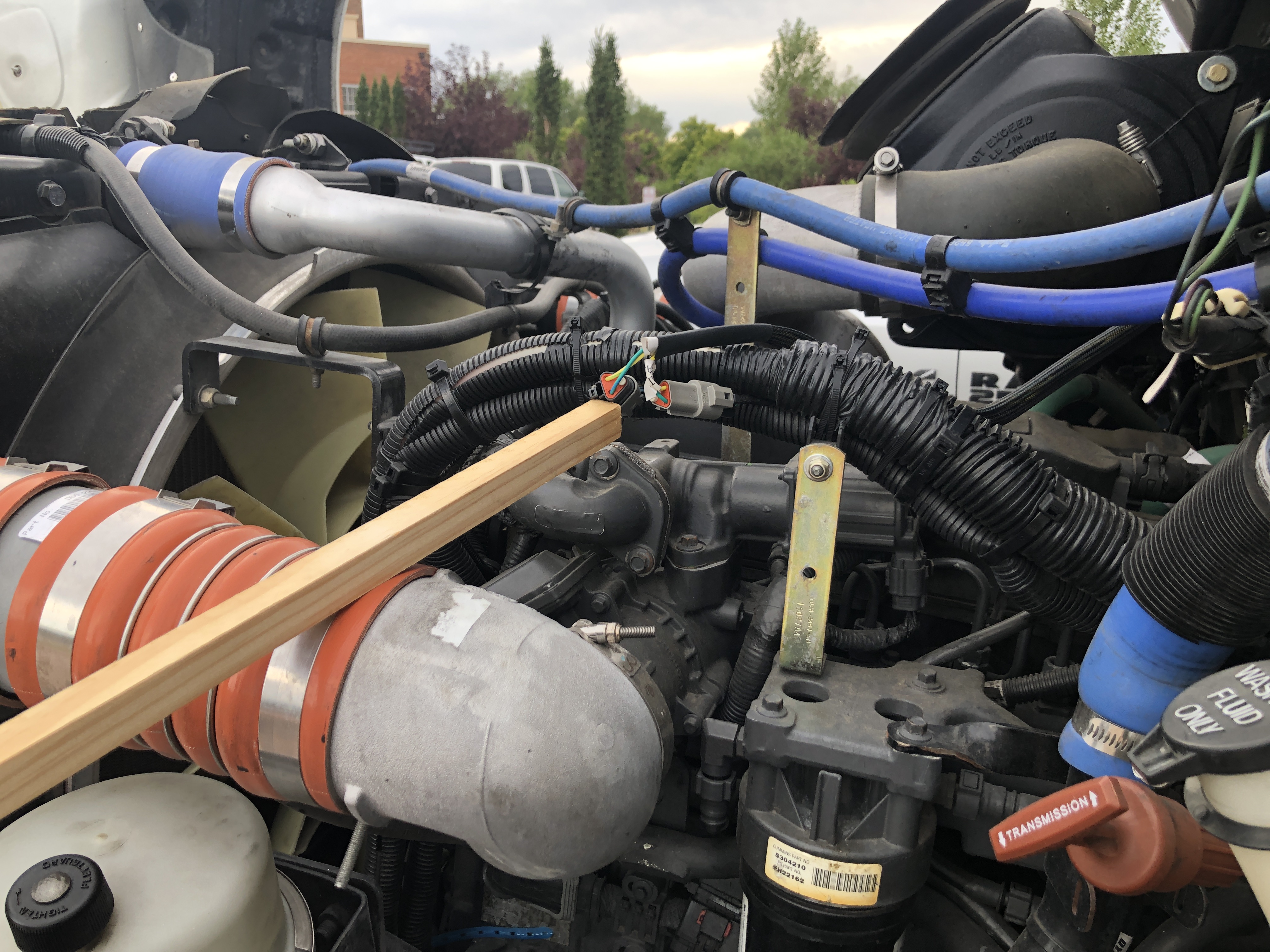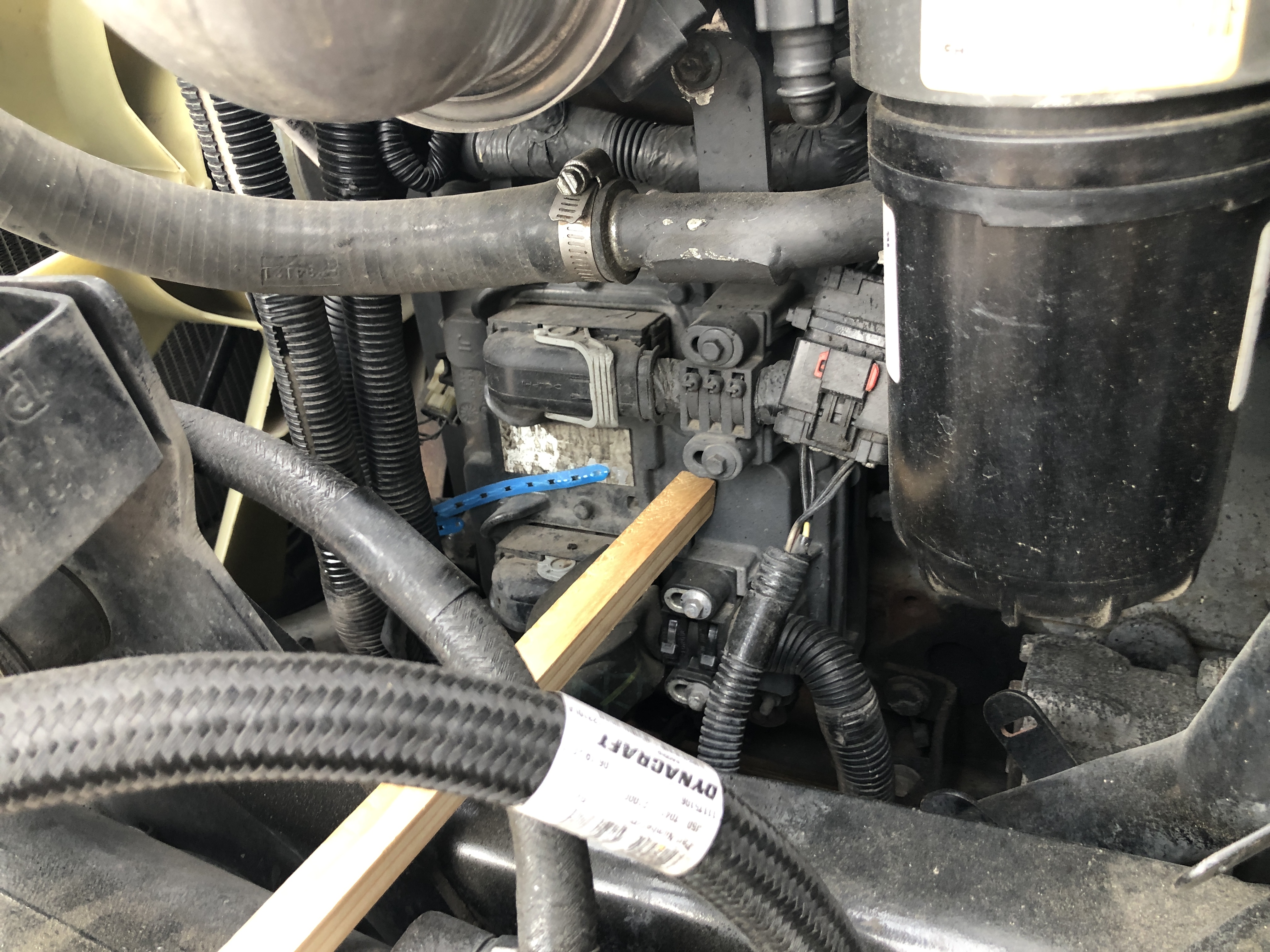 After the installation of the removable wiring, the communications path is routed back into the cab using the network tap. The wiring is shown in the photo below. The square stick is indicating the connection made with the 3-pin Deutsch connectors. To remove the wiretap, simply reconnect the Deutsch connectors and the original wiring will be restored.