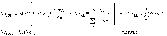 where SusVoli [m3] is the size fraction i suspended volume. The volume of size fraction i transported from the suspended portion of the source cell, "ssusi, into the receiving cell is found as the maximum value between the amount of sediment that can be carried by advection and the amount calculated using the Kilinc and Richardson equation:
