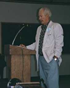 Karl Ebel addresses alumni in the new High School student center.