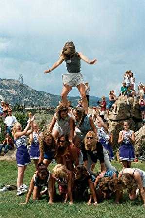 Cheerleaders of the 00's cheer on cheerleaders of the '80's as they attempt a pyramid!