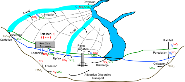 The contamination of river basins by selenium and nitrate is a common problem in many watersheds of the world. Selenium contamination of groundwater and surface water in the western United States particularly is acute. Our research deals with assessing the source and mobilization of selenium, its reactive transport through the aquifer and stream network, and water- and land-management practices that could be implemented to remediate the contamination in the Lower Arkansas River Valley (LARV) in southeastern Colorado. Since selenium is affected chemically by nitrate, nitrate fate and transport often is included in data collection and modeling.
